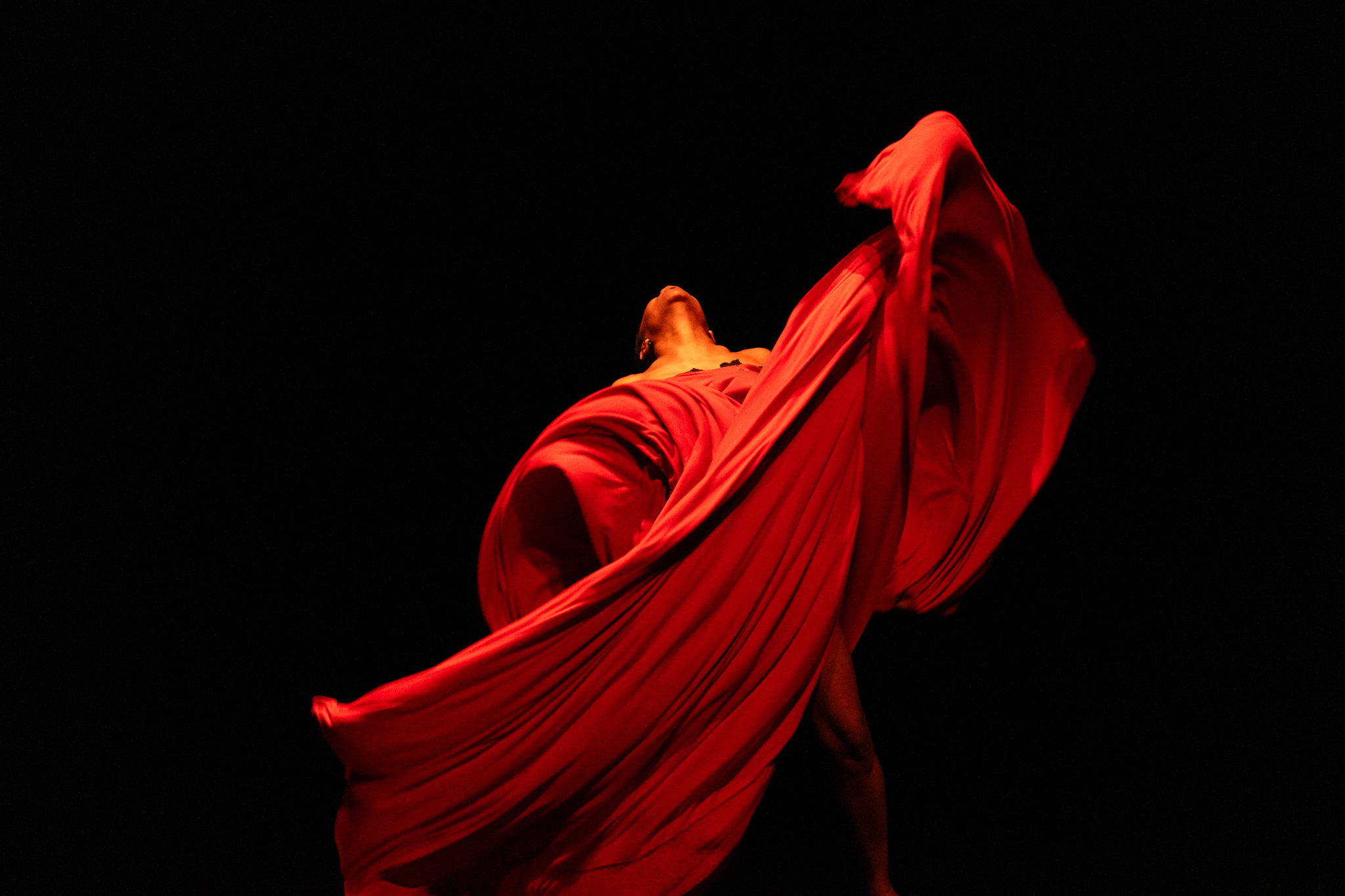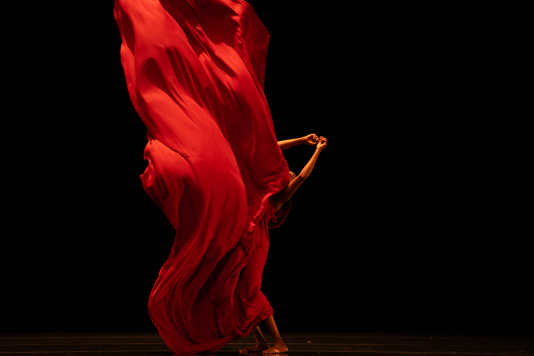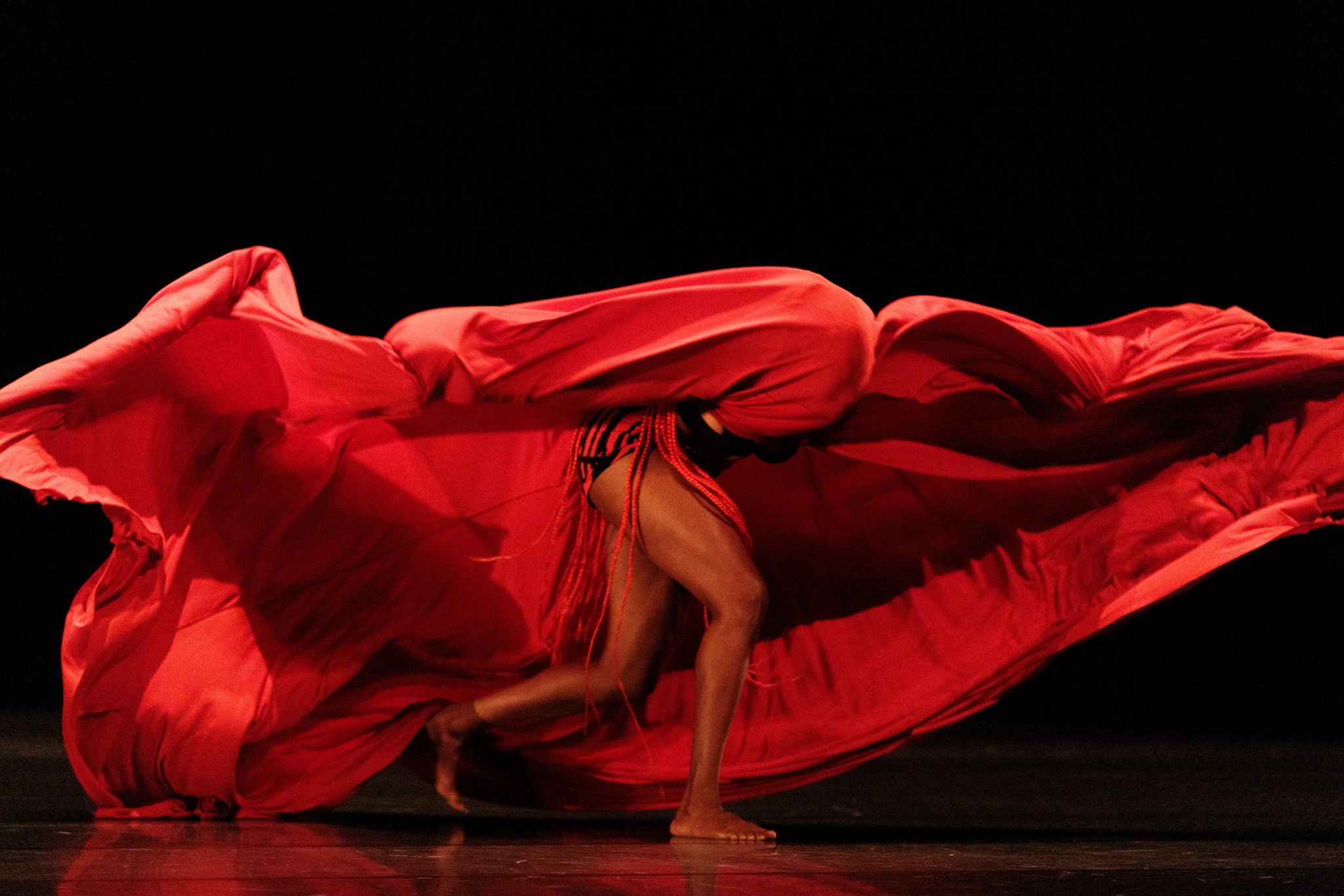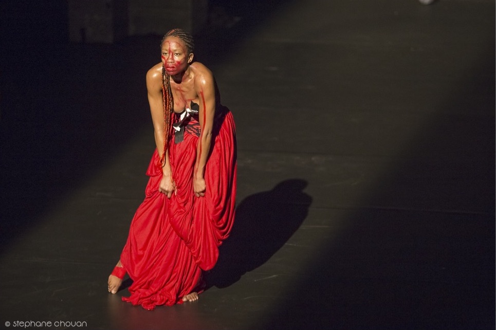 “Kenyan Wanjiru Kamuyu, with an already forged international career, including the USA, attracted a small public triumph, in a Spiral of a solo, stirring a gigantic piece of fabric at times like a prosthetic mingled to her own hair, to straps of her dress, to her partial nudity, in a sacral and incarnated journey of metamorphic tenacity. This power of soloist conviction well echoes the festival’s opening by Germaine Acogny in “Elue noire” choreographed by Olivier Dubois.”